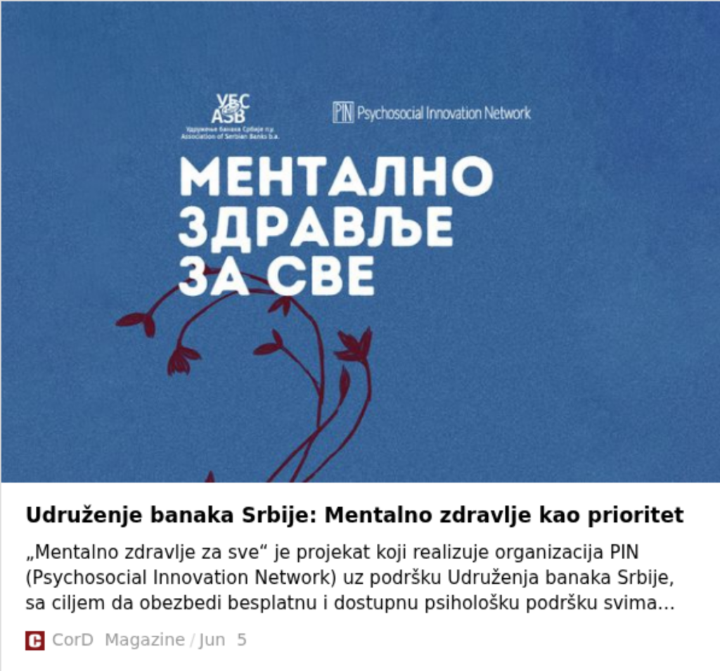 Kako bi doprineli povećanju dostupnih usluga, kao i sistemskom jačanju podrške mentalnom zdravlju, uz podršku Udruženja Banaka Srbije, pokrenuli smo projekat „Mentalno zdravlje za sve“ koji za cilj ima unapređenje mentalnog zdravlja stanovništva Srbije kroz obezbeđivanje besplatnih usluga mentalnog zdravlja u zajednici.