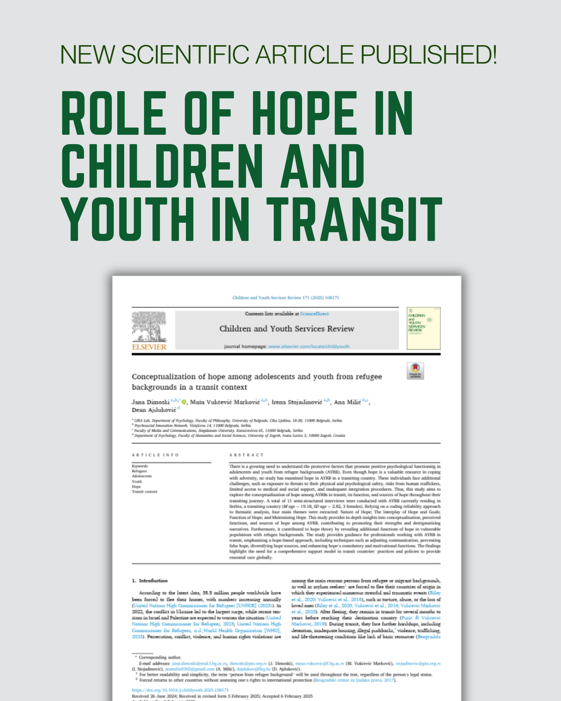 Dimoski, J., Vukčević Marković, M., Stojadinović, I., Milić, A., & Ajduković, D. (2025). Conceptualization of hope among adolescents and youth from refugee backgrounds in a transit context. Children and Youth Services Review, 171, 108171. https://doi.org/10.1016/j.childyouth.2025.108171